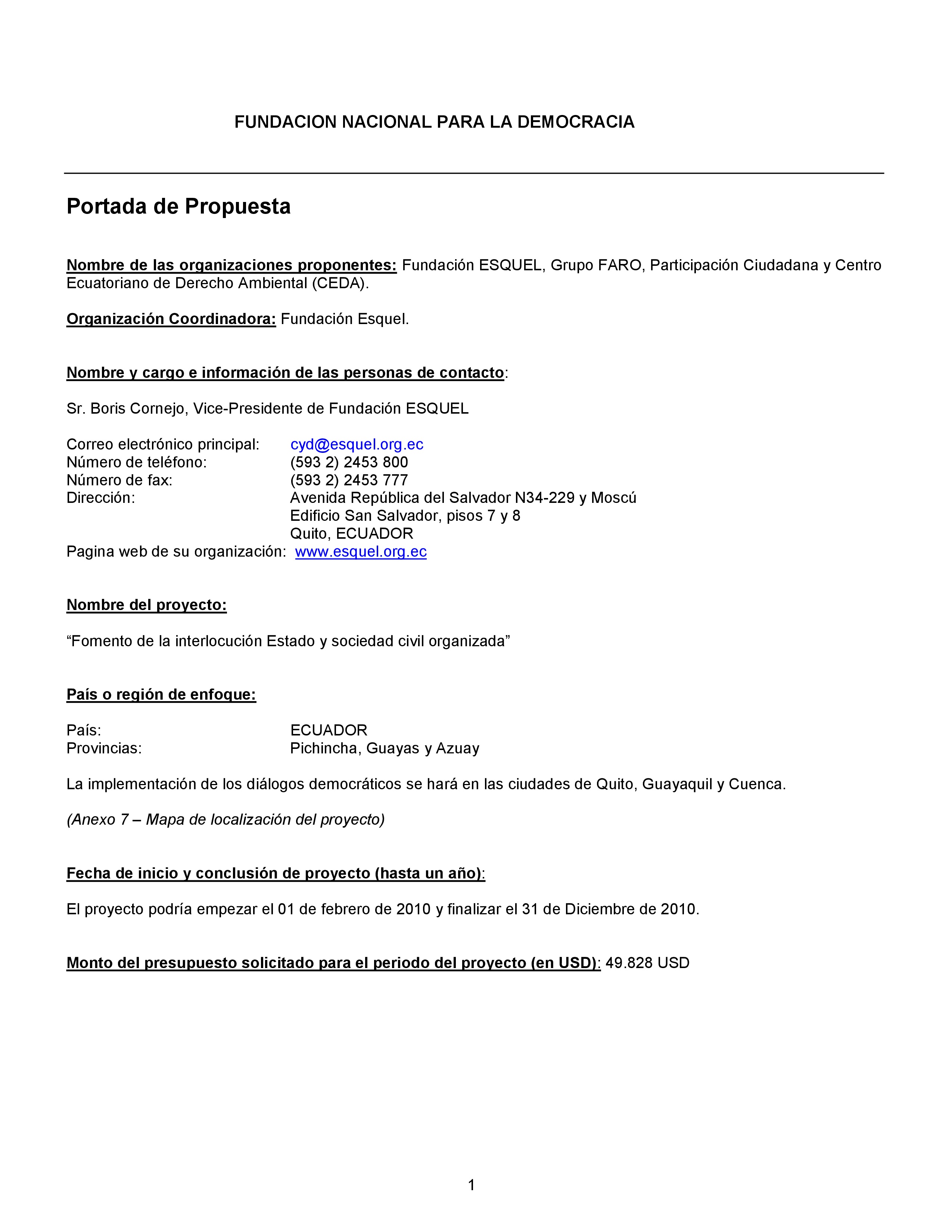 El proyecto “Fomento de la cultura del diálogo en el Ecuador” de una duración de doce meses, b