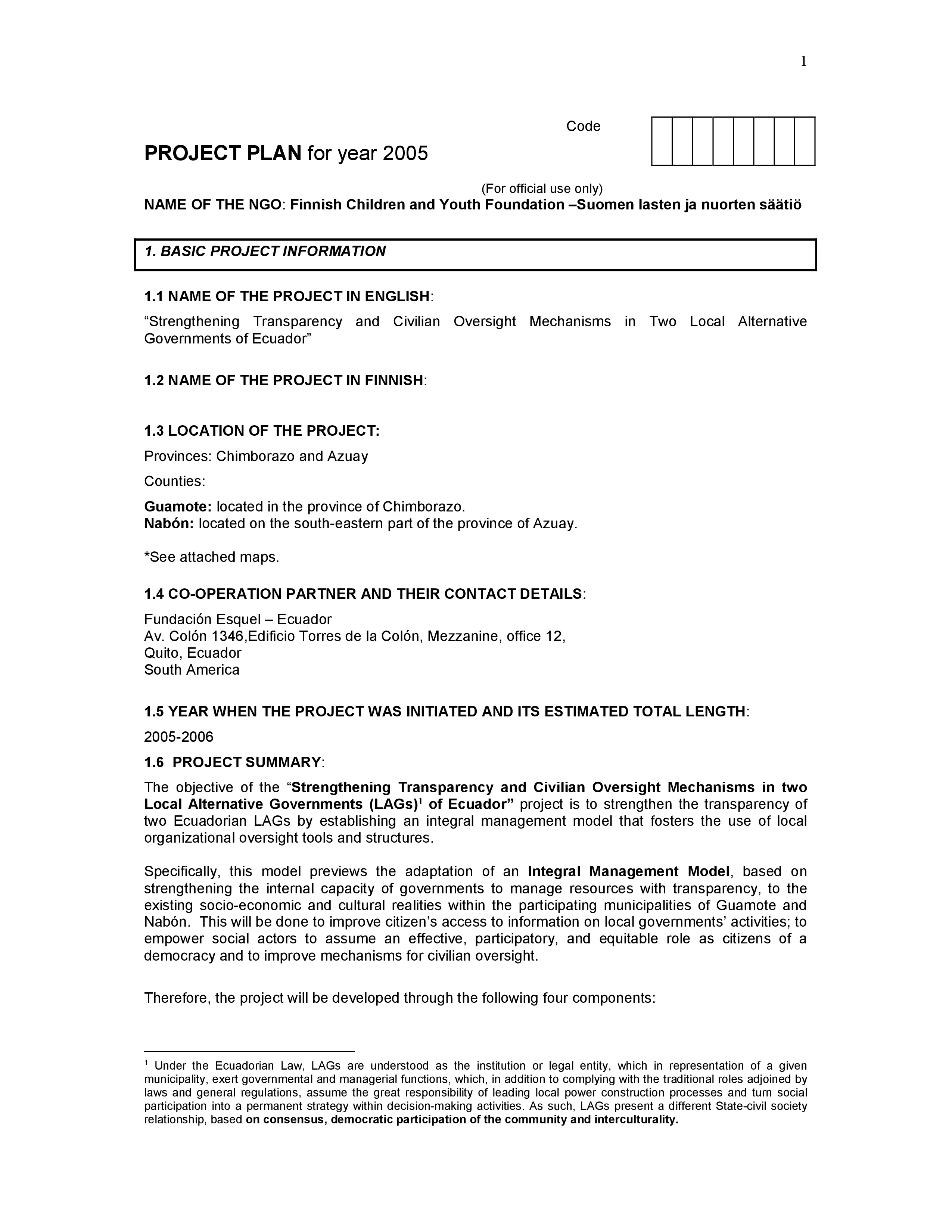 “Strengthening Transparency and Civilian Oversight Mechanisms in Two Local Alternative Governments of Ecuador”. Propuesta final aprobada