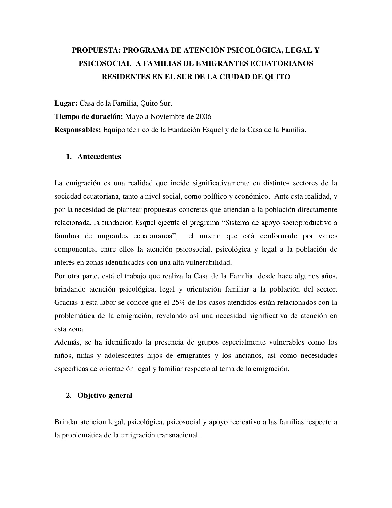 Propuesta: Programa de atención psicológica, legal y psicosocial a familias de emigrantes ecuatorianos residentes en el sur de la ciudad de Quito