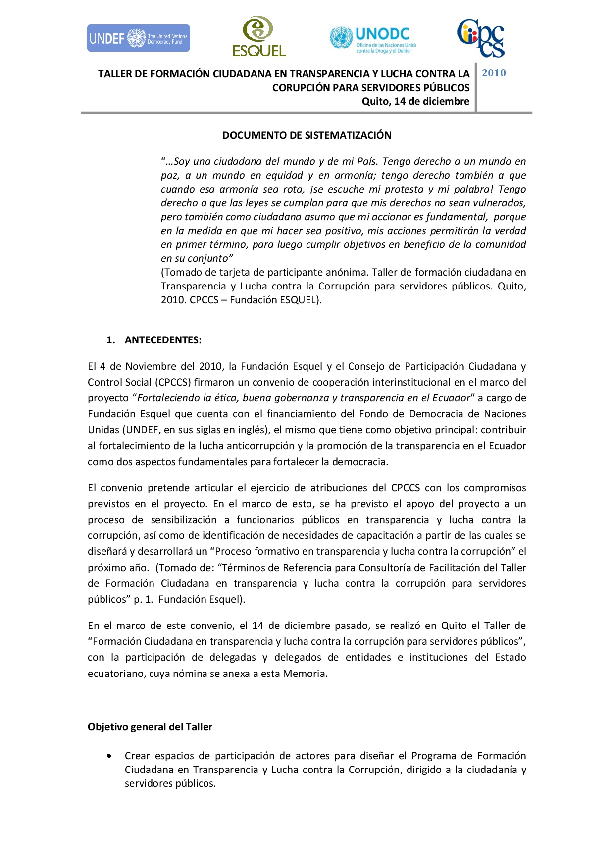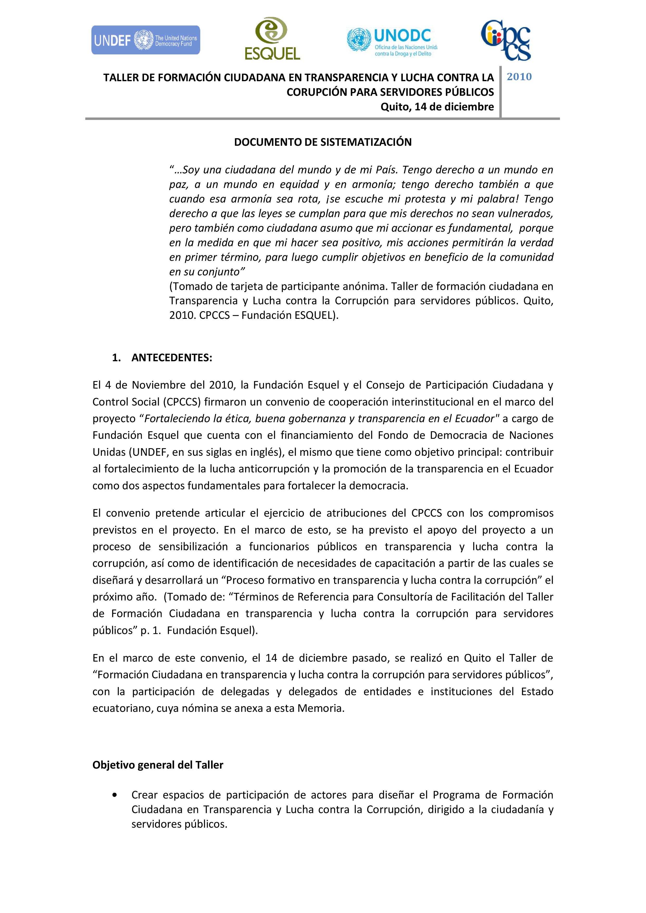 En 2010 la Fundación Esquel y el Consejo de Participación Ciudadana y Control Social (CPCCS) firma